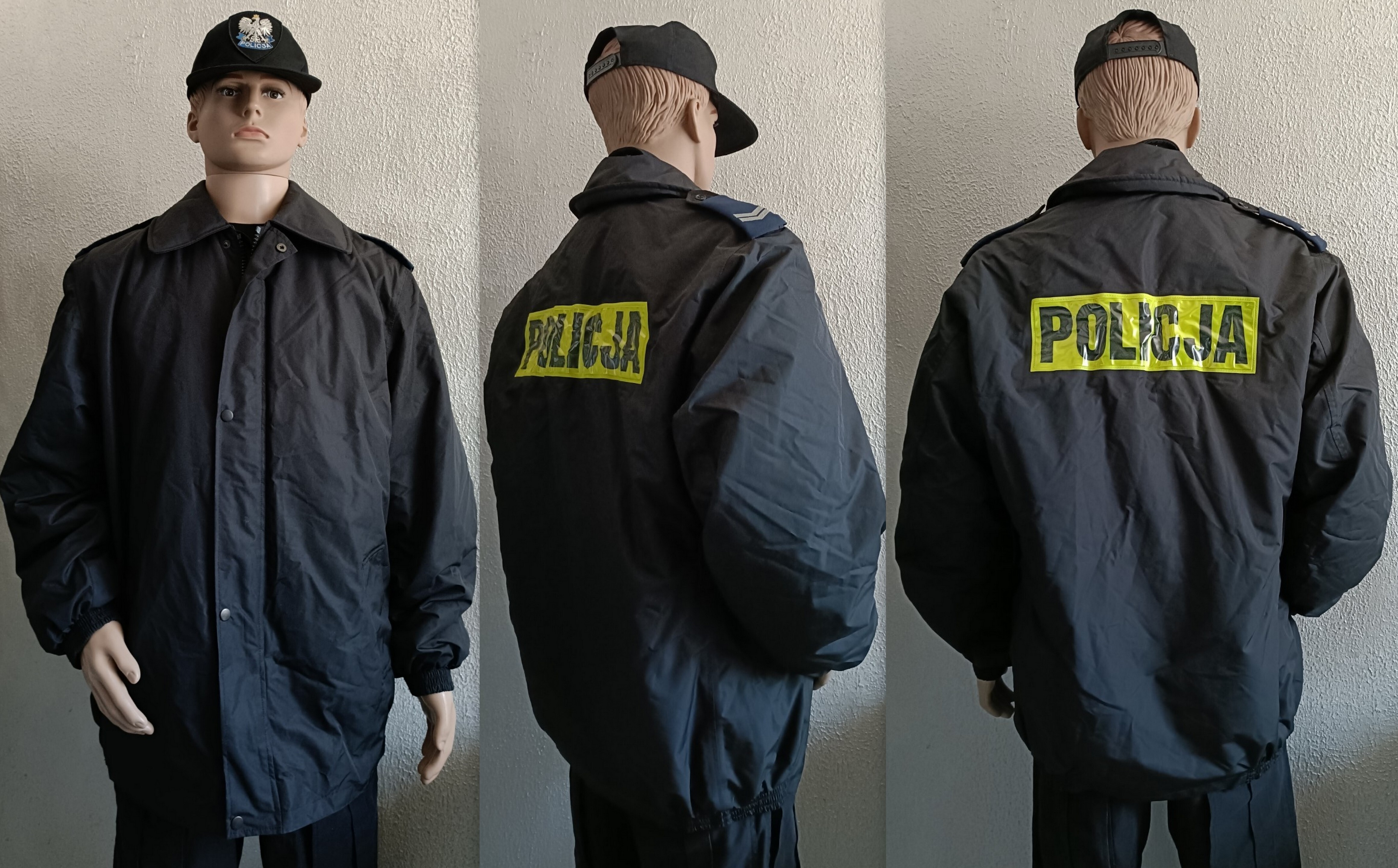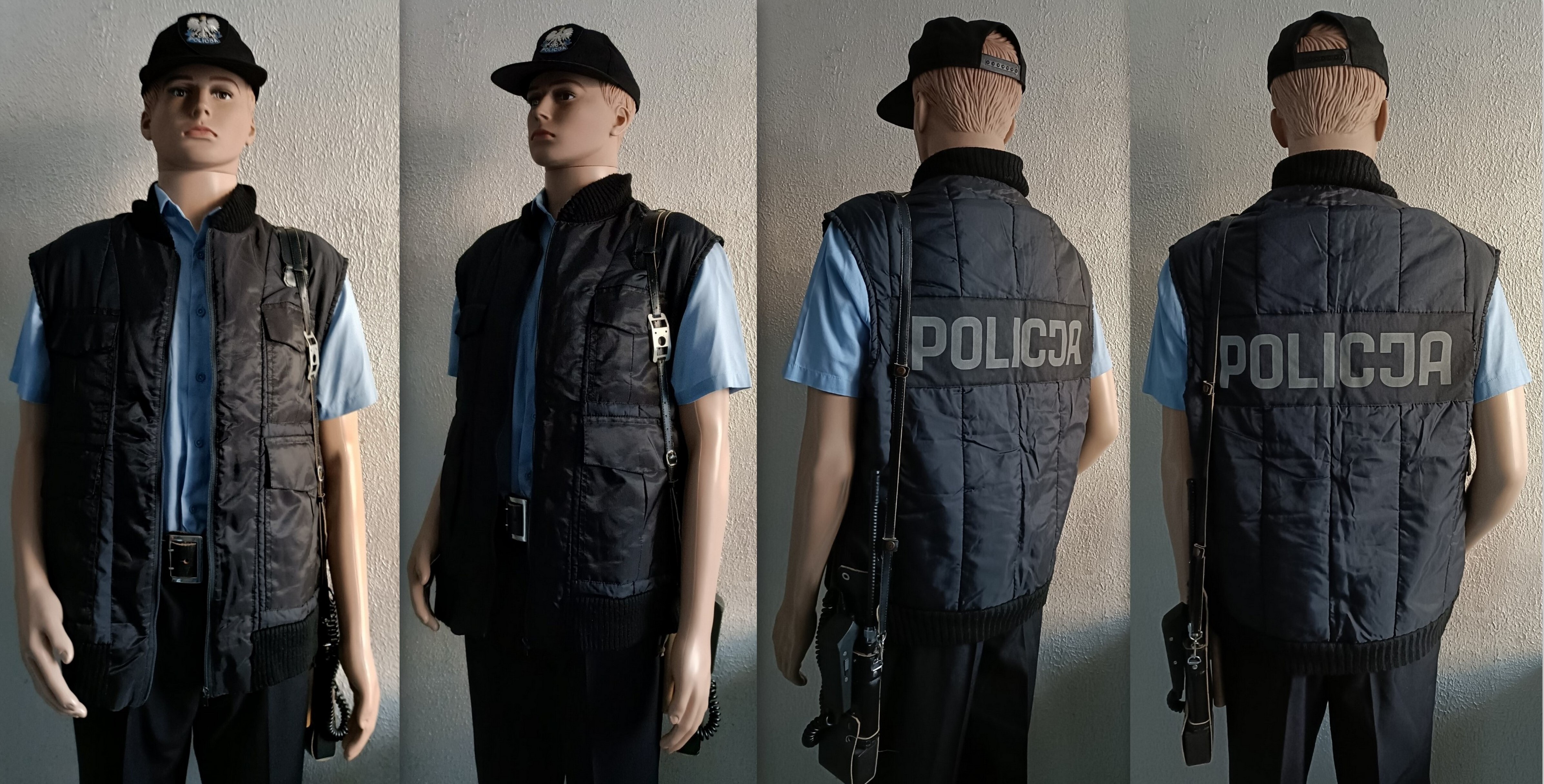 Kamizelka z napisem Policja. Wersja używana przez policjantów, przed wejściem ocieplaczy do czarnego moro. Lata 90